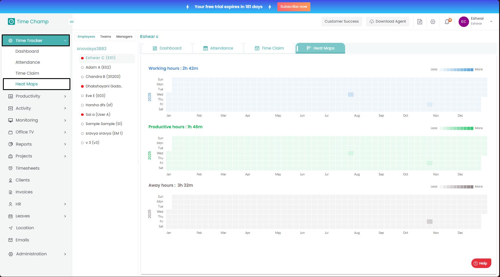 Here, the productive hours are displayed in a calendar-style view, where each day is represented in the same color but with varying intensity. A higher color intensity indicates more productive hours worked on that day. This visualization helps monitor overall productivity trends across yearly, monthly, weekly, and daily levels, as shown in the highlighted area of the image below.