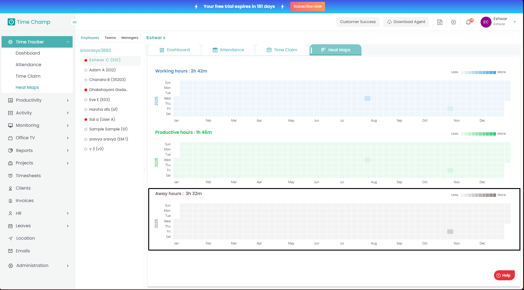 Here, the away hours are shown in a calendar-style view, where each day is displayed in the same color but with varying intensity. A higher color intensity represents a greater duration of time spent away from the system on that day. This view helps track user availability patterns through a graphical format at yearly, monthly, weekly, and daily levels, as shown in the highlighted area of the image below.