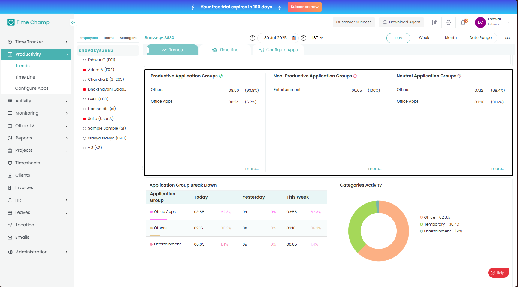 Productive hours: Displays the duration the user spent on productive applications and websites related to work.