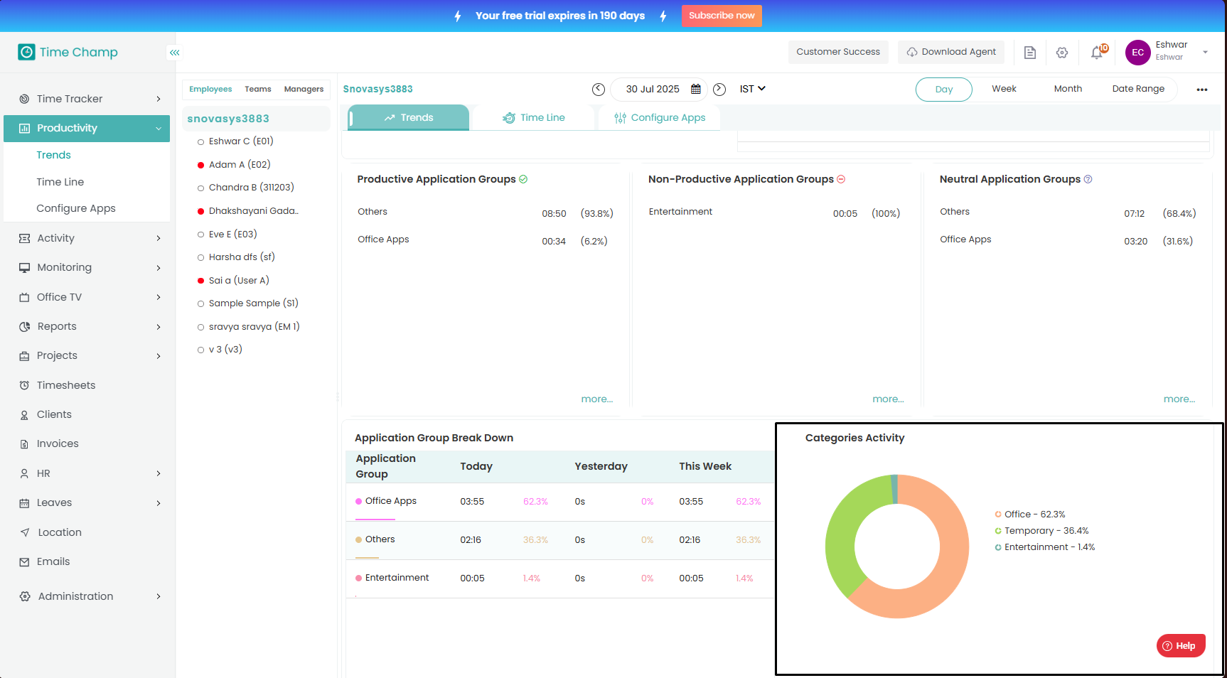 Working hours: Displays the total time worked by the user, including both productive, non-productive and neutral time activities.